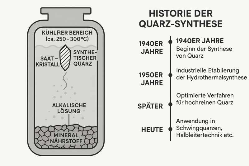 - In den 1940er Jahren begann man mit der Synthese von Quarz in sogenannten Hydrothermalanlagen – ein Verfahren, das natürliche Wachstumsbedingungen imitiert.