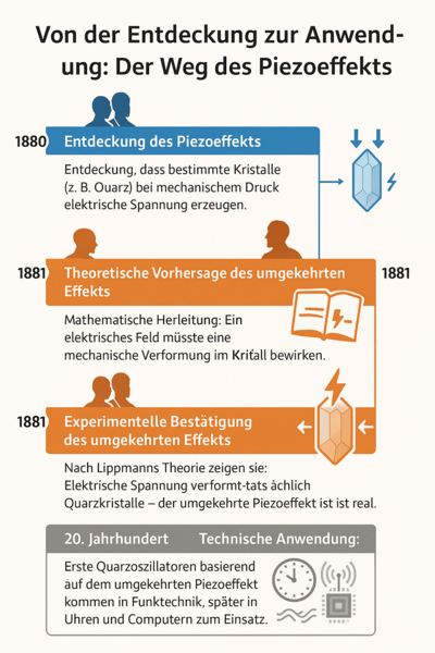 · Beschreibung: Die Brüder Curie bestätigten kurz nach Lippmanns Vorhersage experimentell, dass sich Kristalle unter elektrischer Spannung tatsächlich mechanisch verformen – der umgekehrte piezoelektrische Effekt war damit nachgewiesen.